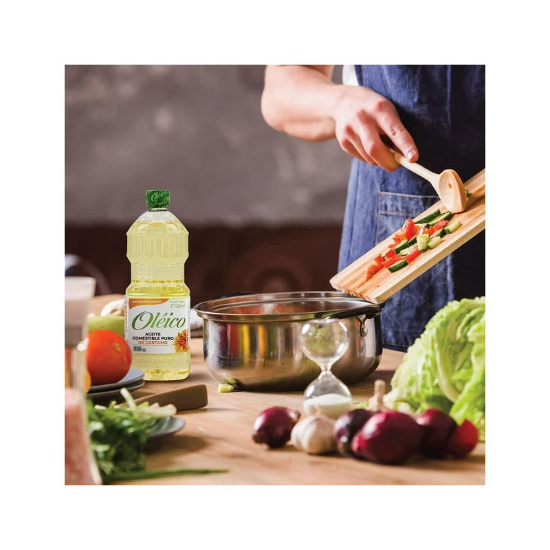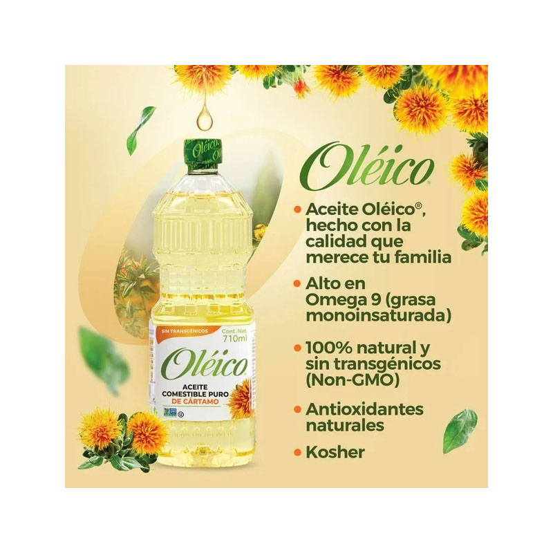 Oléico es un aceite 100 porciento natural, con altos niveles de grasas monoinsaturadas y rico en Omega 9, el balance perfecto en Omega 3, 6 y 9 que te ayudan a controlar los niveles de colesterol y triglicéridos. Sin transgénicos y libre de colesterol por su origen vegetal.
