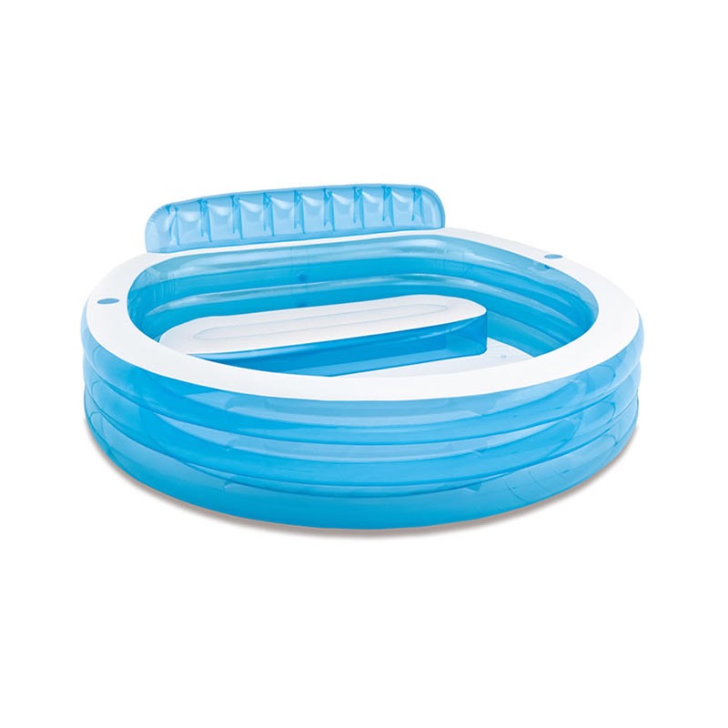 Alberca inflable intex® de la línea swim center. fabricado de vinilo de pvc resistente en color azul. capacidad: 590 litros. dimensiones: 2.29 m x 2.18 m x 79 cm. tiene incorporado un asiento con respaldo para descansar.