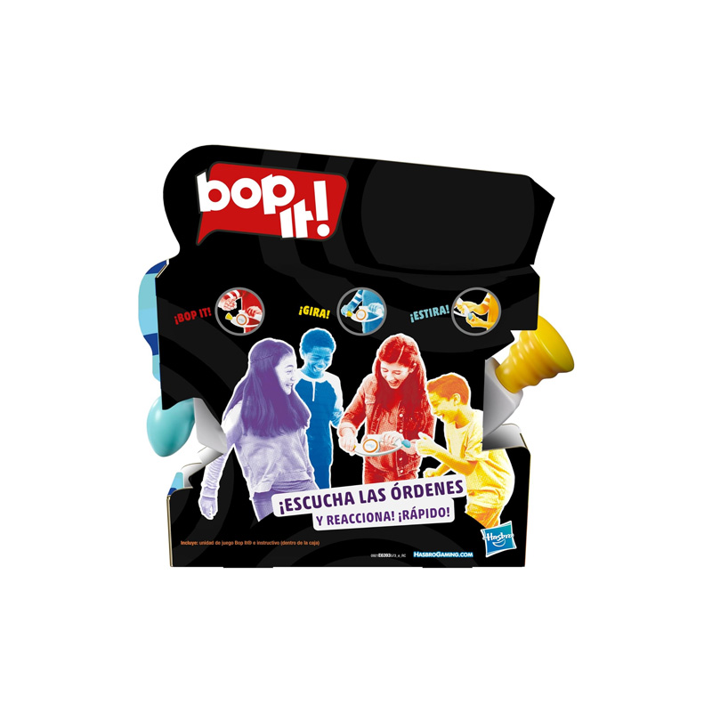 ¡Bop It! ¡Gira! ¡Estira! Diviértete escuchando las órdenes y reaccionando rápidamente para permanecer en el juego.¡Pasa increíbles tardes con tu familia y amigos!