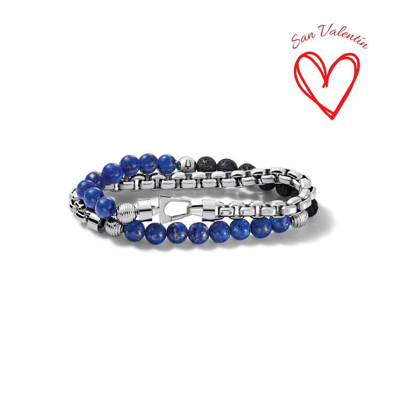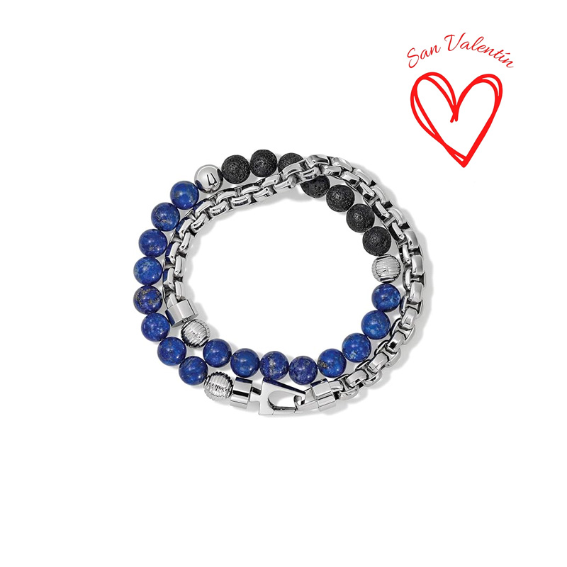 Pulsera de doble envoltura en cadena de eslabones de acero inoxidable y abalorio semipreciosas de 8 mm en lapislázuli y lava negra