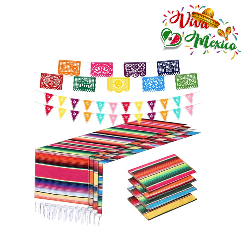 Diseño temático mexicano: estos manteles están diseñados con patrones de rayas y decorados con adornos de borlas, las pancartas colgantes de fiesta están diseñadas con diferentes patrones de varios colores, la pancarta viene con banderines de colores, que representan la rica cultura y el espíritu festivo de México, usarlos como decoración hará que tu fiesta sea atractiva e impresionante