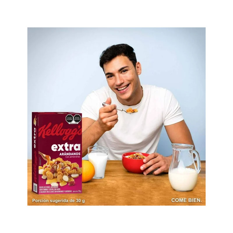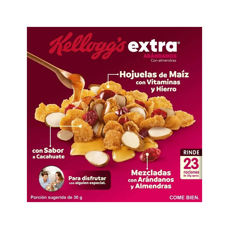 El cereal Extra Arándanos de Kelloggs es una combinación de hojuelas de maíz con sabor a cacahuate mezcladas con arándanos, almendras y un toque de miel que le da un sabor ligeramente dulce. Es delicioso e ideal para el desayuno acompañado con leche y fruta o como un snack. Este cereal aporta vitaminas y hierro, nutrientes importantes para toda la familia.