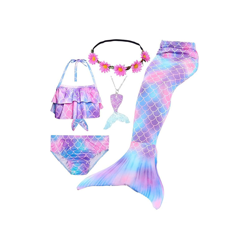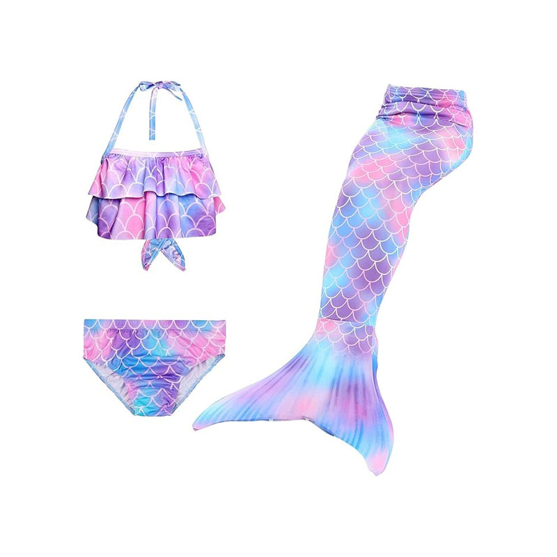 La cola de sirena tiene cierre o botones, por lo que es fácil de poner y quitar el lazo de monofin en la cintura; los agujeros de las piernas de los pantalones cortos están recortados con volantes para un aspecto fino. Diseño inspirado en el cuento de hadas de sirena, lindo y animado. La talla es para 10 a 12 años