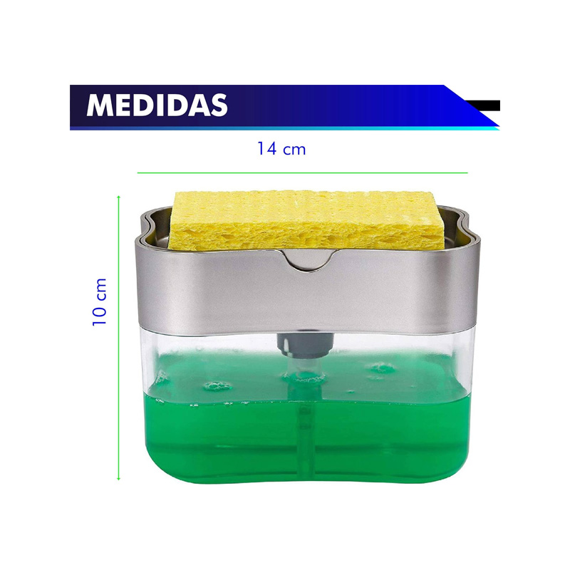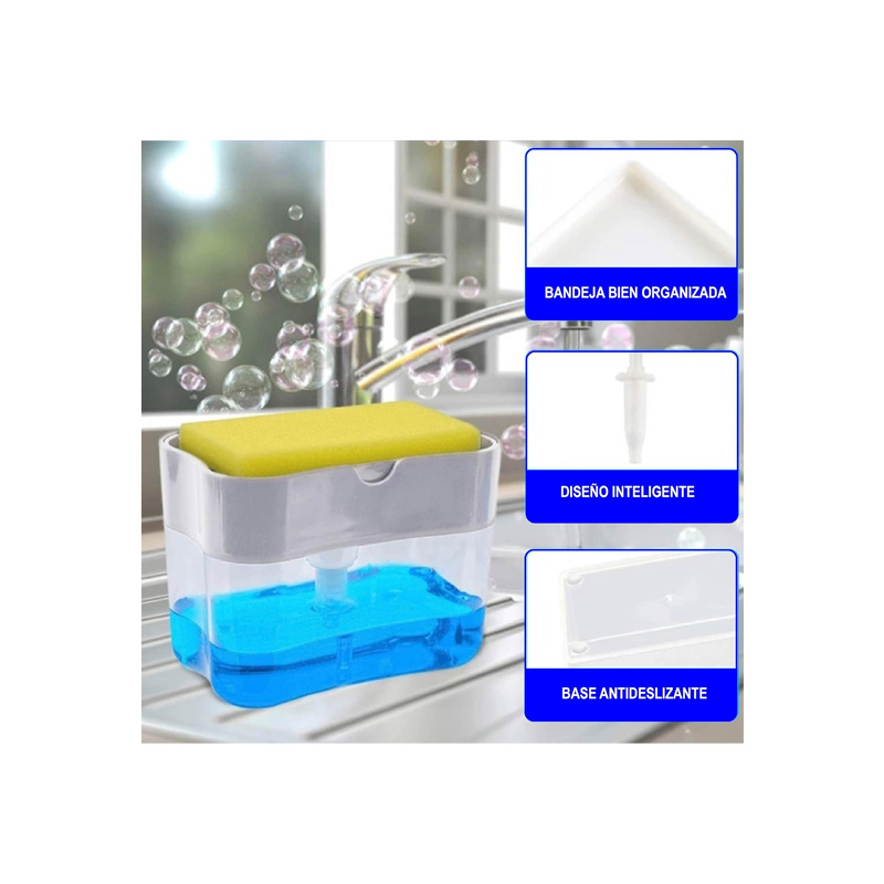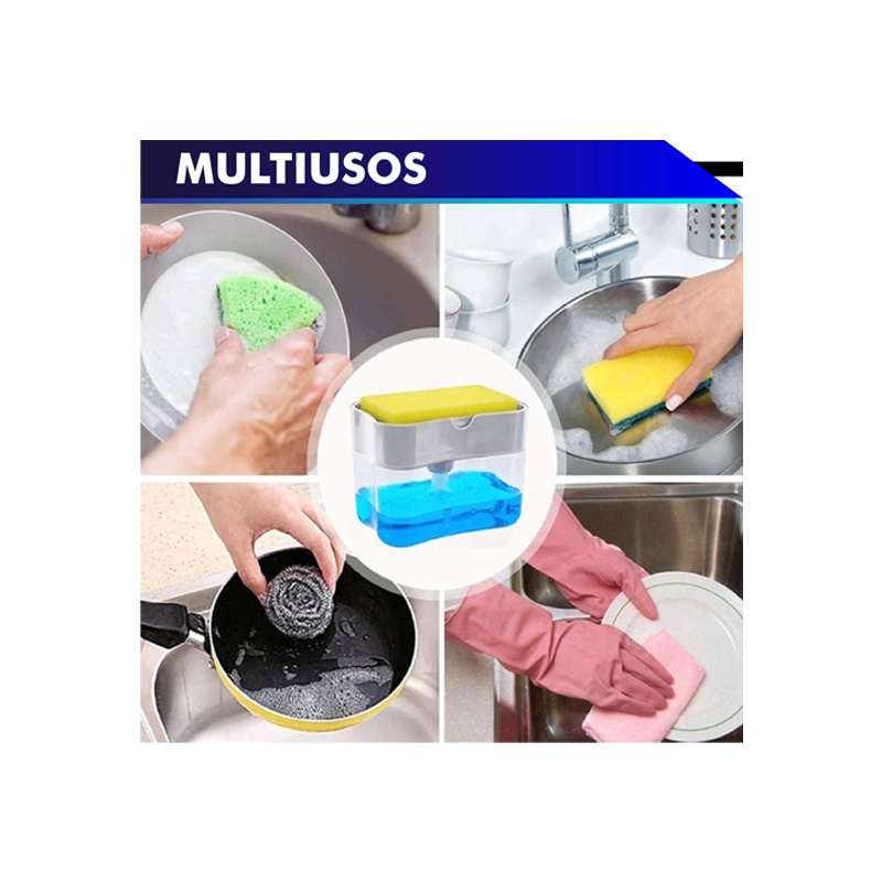 Dispensador instantáneo 2 en 1 operación manual. sostiene esponjas, estropajos, trapos. gracias a su funcionamiento de solo recibir la cantidad exacta de jabón evitaremos que el contacto continuo de la esponja en el agua genere bacterias y moho.