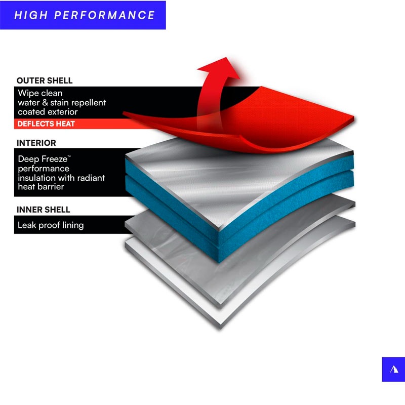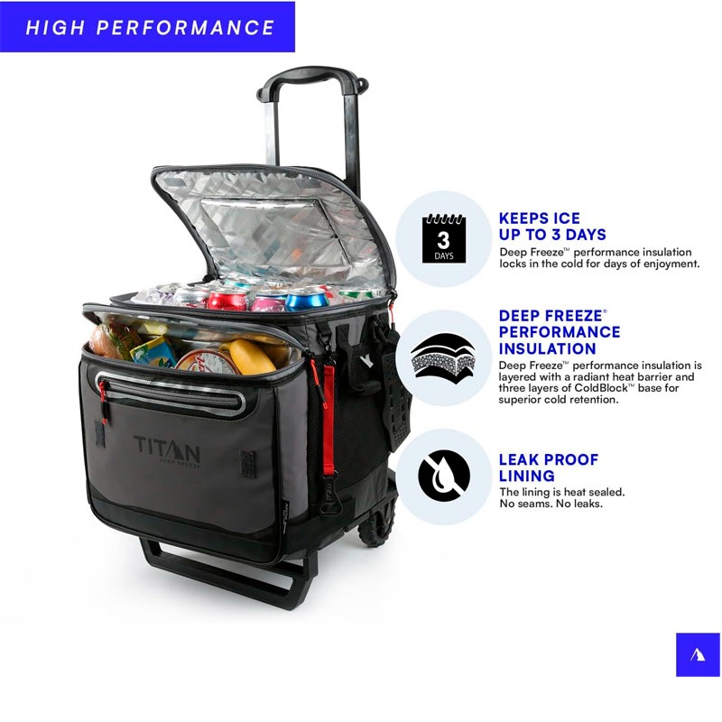 Enfriador de ruedas de congelación profunda TITAN: el enfriador de ruedas cuenta con un compartimento frontal aislado y una tapa de fácil acceso para un acceso rápido a alimentos y bebidas; mantiene el hielo hasta tres días y soporta hasta 60 latas