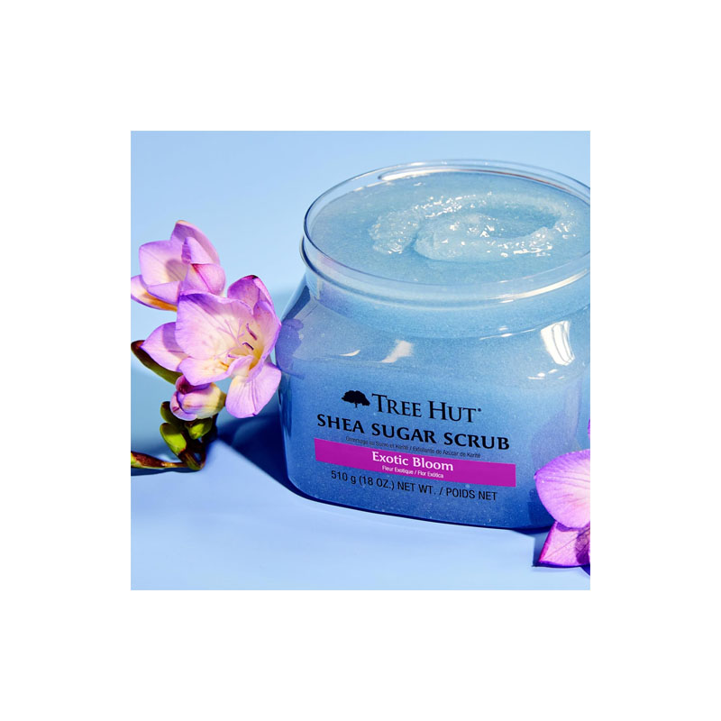 EXFOLIANTE CORPORAL. Mejora tu rutina de baño y vive una experiencia incomparable con el exfoliante corporal Exotic Bloom Shea Sugar Scrub de Tree Hut. Revela una piel suave y brillante con un aroma cálido y floral.