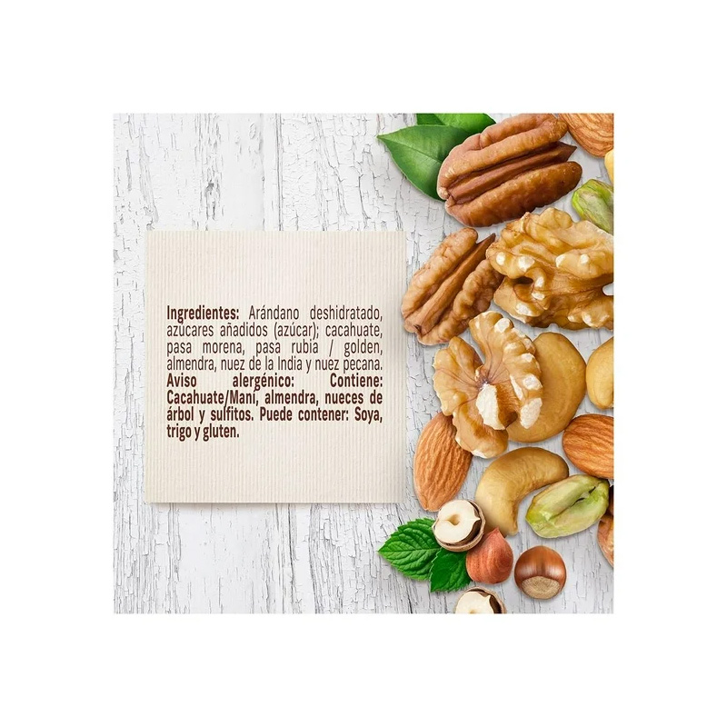 Una deliciosa combinación de frutas deshidratadas que incluye nuez de la India, fresa, almendra, pasa rubia, nuez pecana, arándano, pasa morena y cacahuate, que no contiene colesterol, grasas trans, por su origen vegetal.