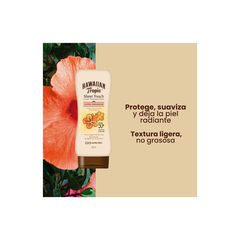 Disfruta del sol de la manera más divertida con nuestra increíble loción protectora Hawaiian Tropic Sheer. Con un factor de protección solar de 50+, esta loción no solo te protegerá de los rayos UVB y UVA, sino que también mantendrá tu piel hidratada y llena de vitalidad. ¡Decimos adiós a la sensación grasosa! Su textura ligera se absorbe rápidamente y deja tu piel radiante. Pero eso no es todo, nuestro producto ha sido dermatológicamente probado, lo que garantiza su eficacia y seguridad. Además, contiene extractos de té verde y antioxidantes que ayudan a cuidar y rejuvenecer tu piel. Así que no esperes más, lleva contigo la verdadera experiencia tropical con Hawaiian Tropic Sheer, protege tu piel mientras disfrutas del sol.