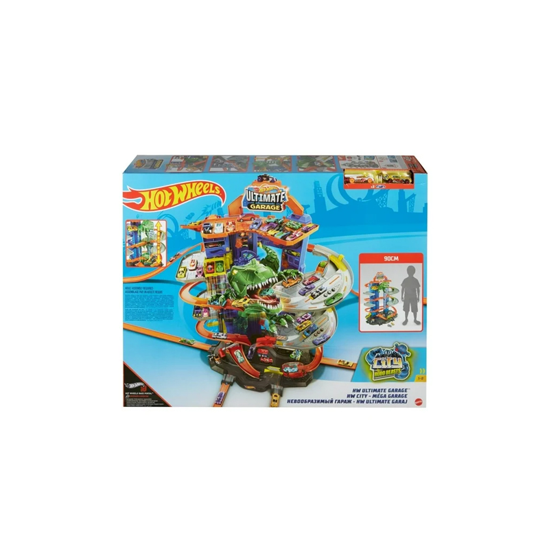 Esta pista Hot Wheels ofrece una emocionante aventura en la ciudad con una torre vertical de 90 cm de altura que permite almacenar fácilmente mas de 100 vehículos, incluye al hambriento Robo T Rex que intenta devorar los autos y reta a los niños a escapar en emocionantes juegos de acción, brinda infinitas oportunidades para crear historias llenas de velocidad diversión y aventura mientras mantiene los vehículos organizados y listos para jugar.