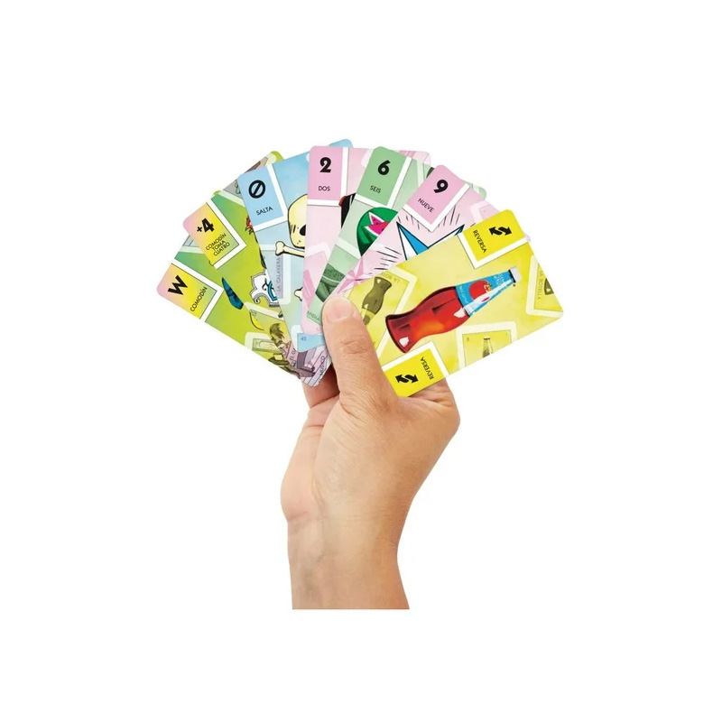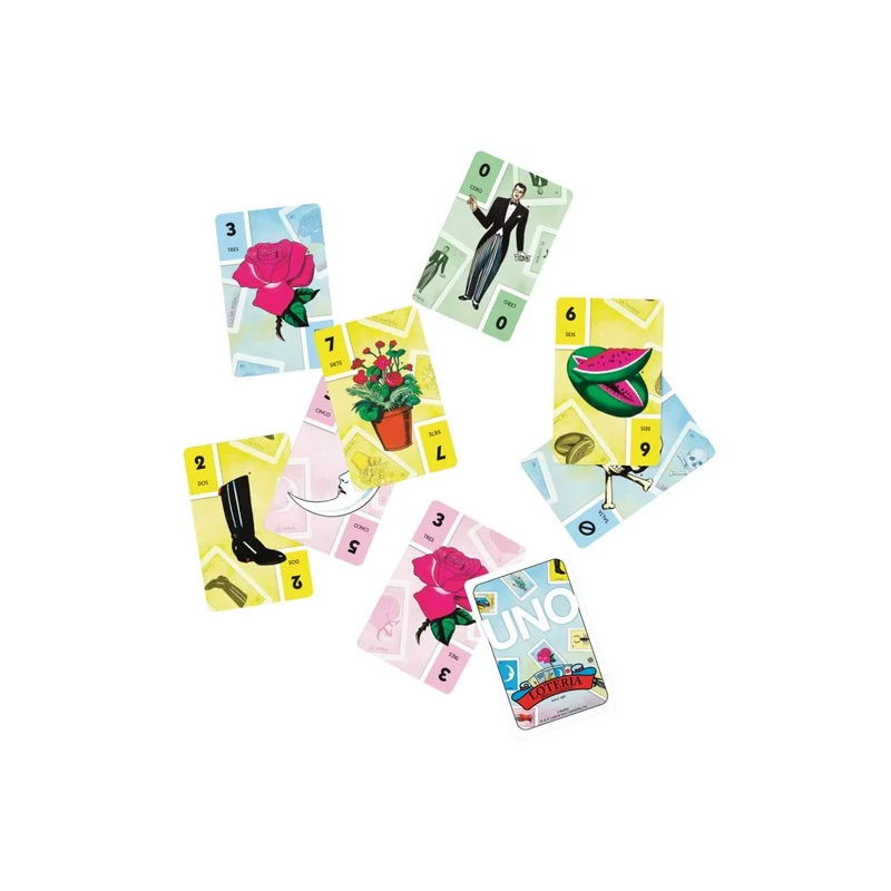 El juego de cartas UNO inspirado en la tradicional Lotería mexicana combina la dinámica clásica que los jugadores aman con ilustraciones vibrantes y coloridas del icónico juego popular, incluyendo figuras reconocidas como El Gallo y La Estrella. Mantiene el formato original de UNO en el que los participantes emparejan colores y números para deshacerse de todas sus cartas lo más rápido posible, sin olvidar gritar UNO cuando solo quede una carta. Diseñado para 2 a 10 jugadores a partir de los 7 años, este juego coleccionable es una excelente opción de regalo para quienes disfrutan de los juegos de cartas y de la riqueza cultural de México.