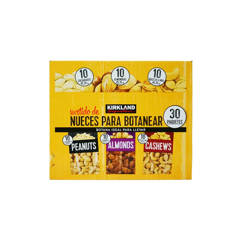 Disfruta del práctico surtido de nueces Kirkland Signature, perfecto para botanear o llevar contigo a cualquier lugar gracias a sus 30 paquetes individuales. Incluye 10 paquetes de cacahuates, 10 de almendras y 10 de nueces de la India, brindándote una mezcla deliciosa, nutritiva y conveniente para cualquier momento del día.
