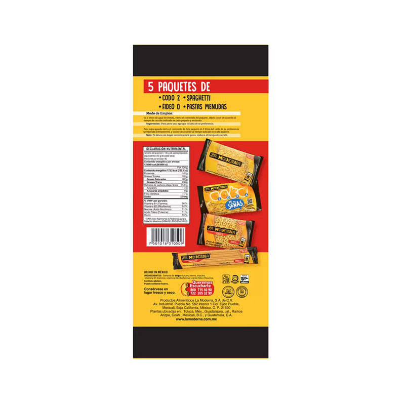 Pasta elaborada con sémola de trigo durum, enriquecida de vitaminas, hierro y ácido fólico. Producto 100 porciento mexicano que ofrece una excelente calidad y variedad de cortes, rendidora para toda la familia y caracterizada por darle un aspecto antojable a tus platillos especiales.