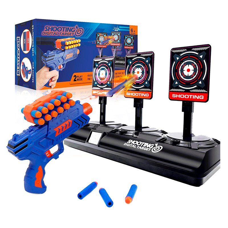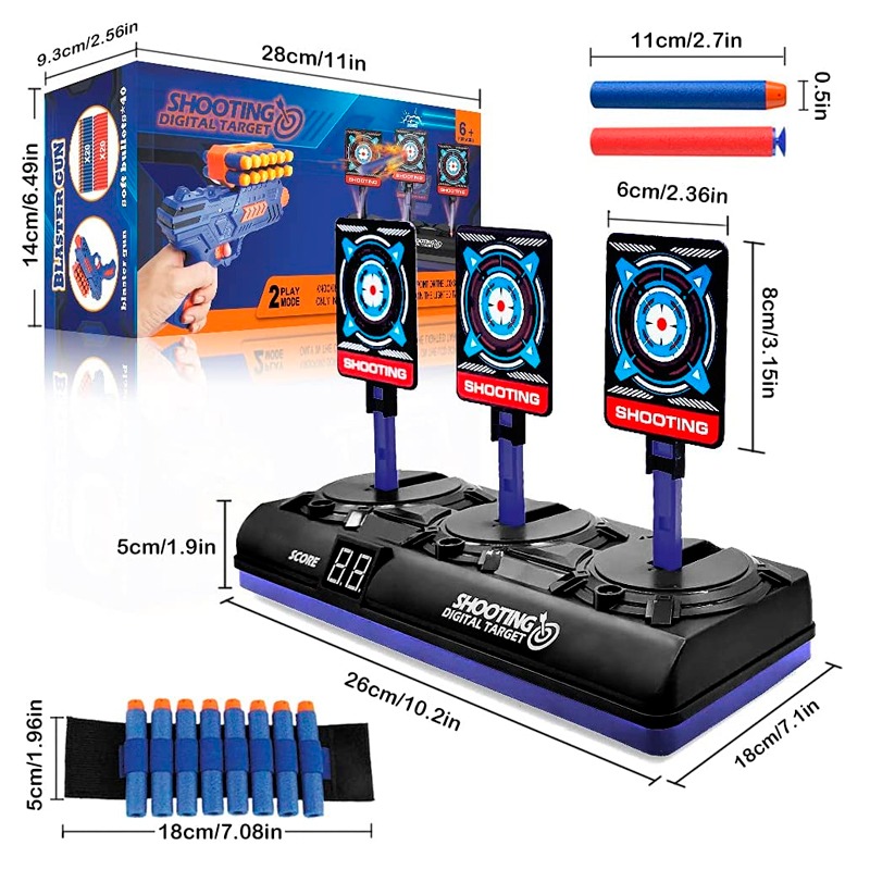 Juego de objetivos de tiro : tiene todos los accesorios de tiro necesarios para comenzar con su práctica de tiro. Nuestro paquete incluye un objetivo de tiro con puntuación digital, 1 pistola de juguete, 40 dardos de espuma, 1 pulsera para mantener los dardos a mano, 1 manual de usuario. Seguramente sus hijos se divertirán con nuestro diana.Puntaje Electrónico y Restablecimiento Automático: Equipado con un contador interno, los puntajes se mostrarán en el marcador digital LCD. MODO 1 (puntuación máxima: 99): golpea un objetivo para obtener 1 punto. Cuando los tres objetivos son derribados. MODO 2 (puntuación máx.: 30): Golpea el objetivo iluminado para obtener 1 punto, los 3 objetivos caen y vuelven a levantarse en 1 ronda (máx. 10 rondas).