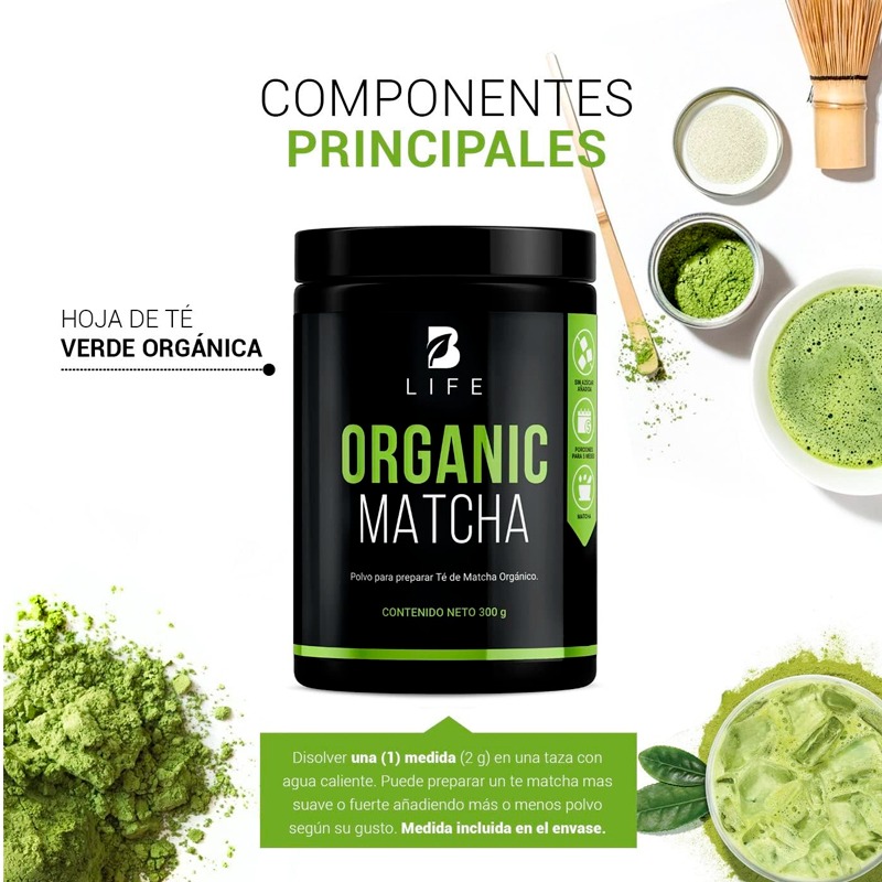 Ingredientes naturales: Té verde puro Orgánico. Organic Matcha B Life.
