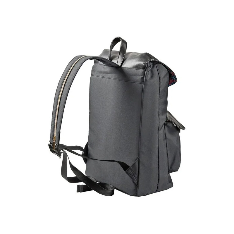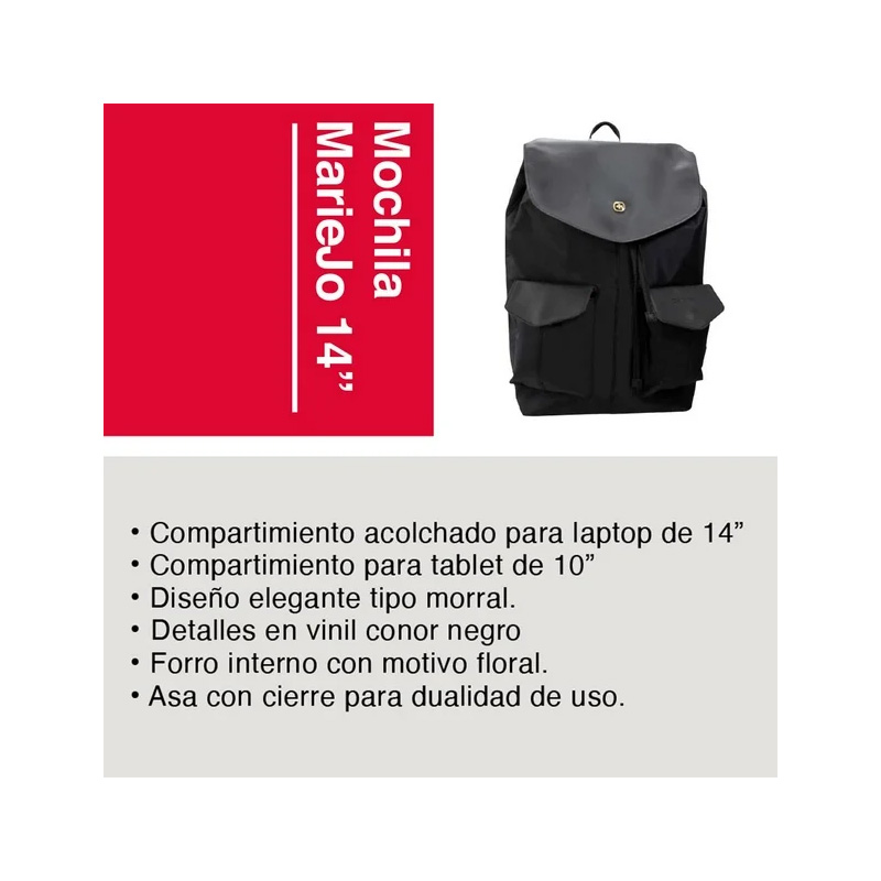 En el interior de esta mochila puedes guardar una laptop de hasta 14 pulgadas o una tablet de 10 pulgadas. Su correa ajustable permite abrir y cerrar el acceso al bolsillo principal, protegido además por una solapa con placa del logo y un broche de presion para mayor seguridad. En la parte frontal cuenta con dos bolsillos para objetos pequeños. Una característica destacada de la MarieJo es su correa convertible con cierre, que le da doble uso y un toque innovador a su diseño tipo morral.