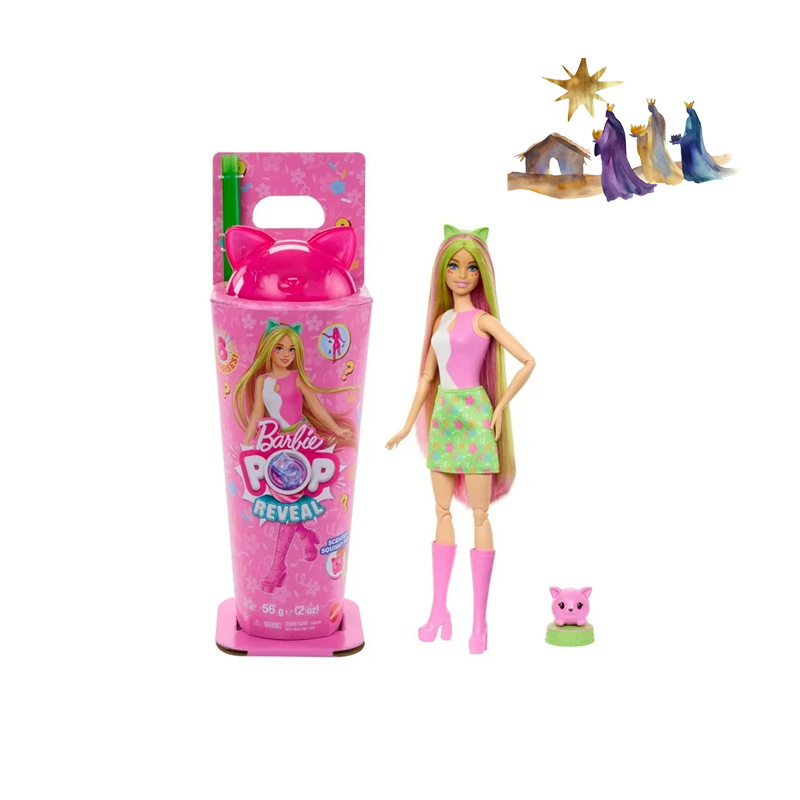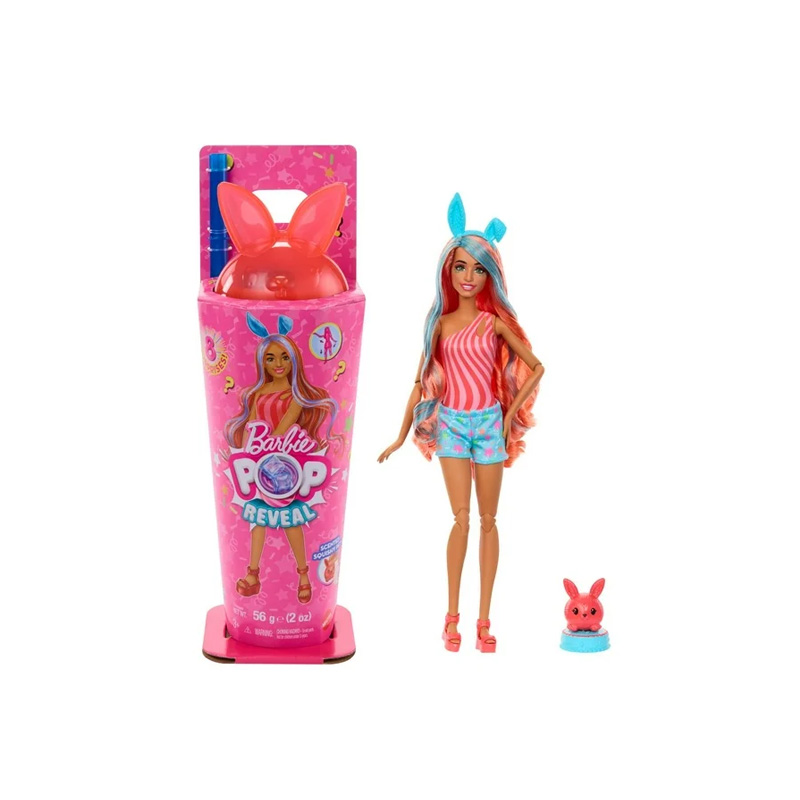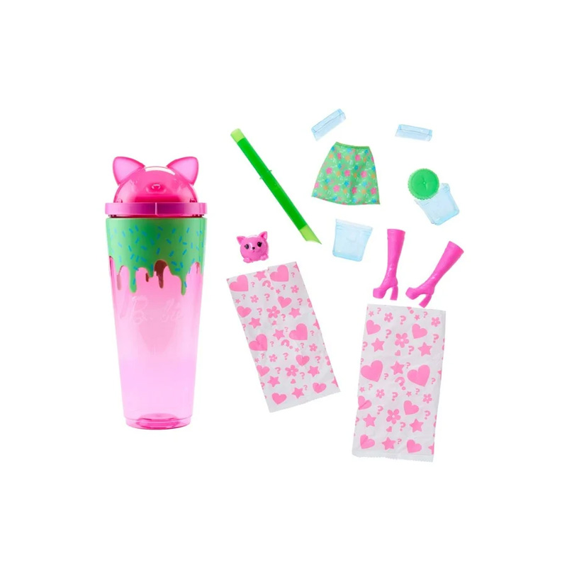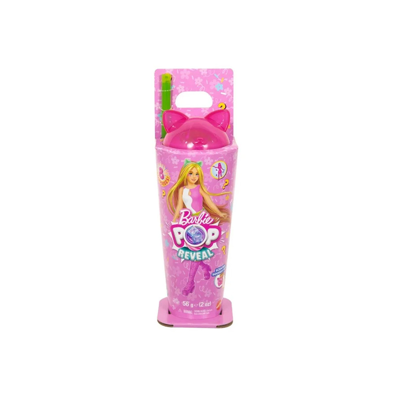 Barbie Pop Reveal Serie de Animalitos Sorpresa ofrece una experiencia sensorial con ocho sorpresas dentro de un vaso con temática de malteada, incluyendo slime brillante, una muñeca aromática, accesorios y una mascota perfumada con cama y diadema. Descubre ropa y calzado ocultos en cubitos de hielo reutilizables y disfruta del efecto de cambio de color en el rostro de Barbie con agua fría o caliente. Disponible en tres estilos coleccionables: unicornio, gatito y conejito.