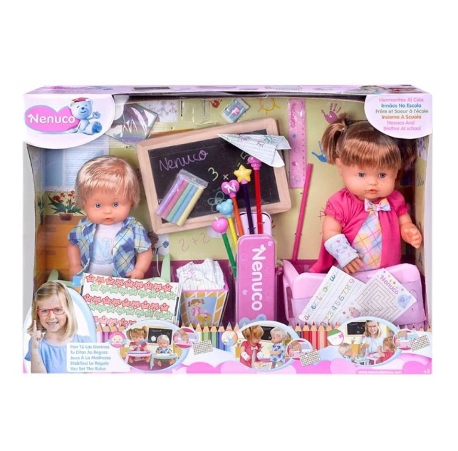 Nenuco y su hermano en la escuela son dos hermanos listos para ir a la escuela, Dos Nenuco incluidos: la niña es una muñeca de 42cm con cabello rubio; y el niño es un muñeco de 35cm.
