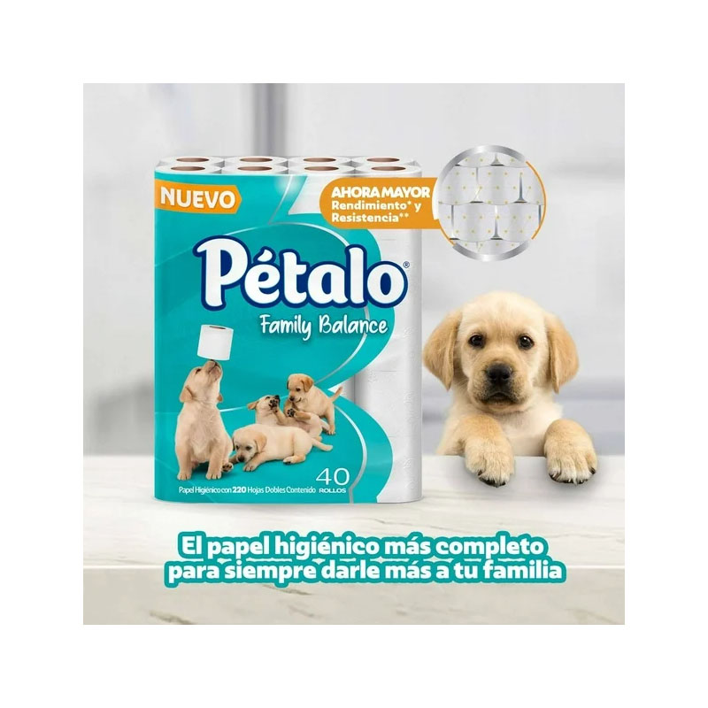 El papel higiénico Pétalo Family Balance es un artículo de higiene personal mucho más suave y absorbente. Cuenta con 40 Rollos con 220 hojas dobles para un mayor rendimiento que cuidará tu piel y la de toda tu familia. Es ideal para todos en casa.