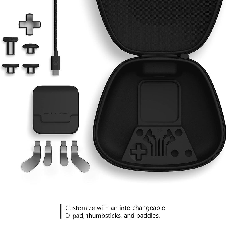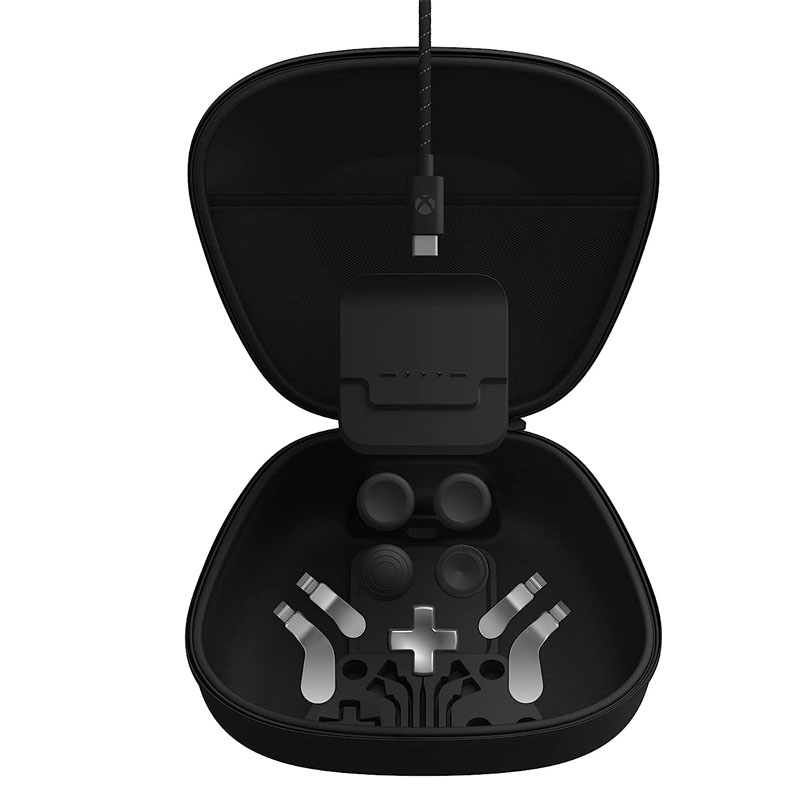 Incluye: Estuche de transporte Base de carga Palanca clásica (2) Palanca alta (1) Palanca de cúpula (1) D-pad en forma de cruz (1) Juego de 4 paletas: Medianas (2), Mini (2)