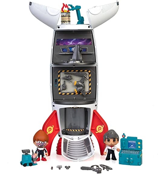 Lugares dentro del cohete para jugar con los accesorios y con los pilotos del cohete, Dos pisos giratorios con diferentes elementos para jugar, Dos figuras incluidas, una de ellas con cara de impostor por detrás