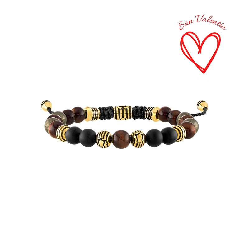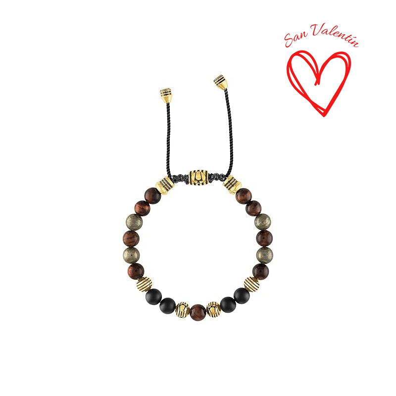 Características: piedra preciosa de ojo de tigre café rojizo; un símbolo de fuerza, ónix negro mate semiprecioso; una piedra de protección y resistencia, y pirita mate, conocida por su confianza y protección