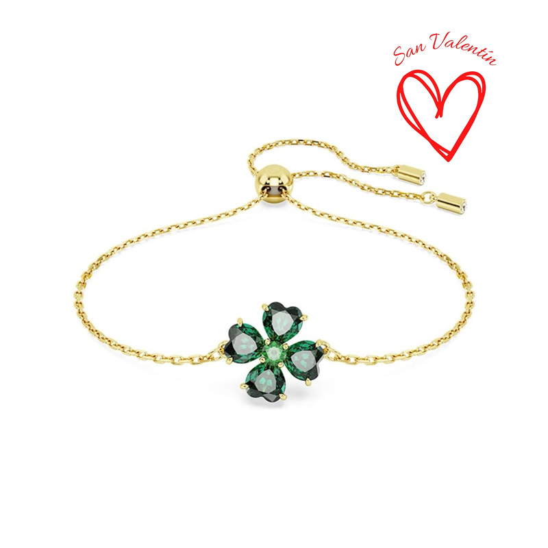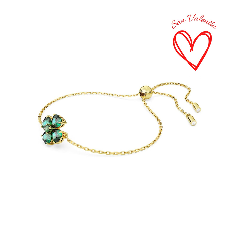 Esta encantadora pulsera de la familia Idyllia le dará un toque de lujo a cualquier look. El diseño bañado en tono oro cuenta con un motivo de trébol verde elaborado con cuatro cristales en forma de corazón dispuestos alrededor de una piedra central, y se asienta sobre una cadena con cierre ajustable. Combina esta pulsera con el par de pendientes de trébol Idyllia a juego y déjate inspirar por la naturaleza.