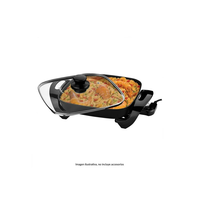 Esta sarten electrica Oster ofrece una coccion mas rapida y uniforme gracias a su diseno eficiente y a su interior antiadherente que permite preparar alimentos sin necesidad de aceite. Cuenta con una tapa de cristal templado transparente con borde de acero inoxidable que brinda mayor durabilidad y permite visualizar fácilmente la preparación de los alimentos, así como un termostato desmontable con selector de temperatura en diferentes posiciones para un mejor control de cocción. Su versatilidad permite preparar desde carnes a la sartén hasta platillos mas elaborados como arroz con mariscos, y al ser eléctrica no ocupa espacio en la estufa, convirtiéndola en una opción practica y funcional para el uso diario en el hogar.