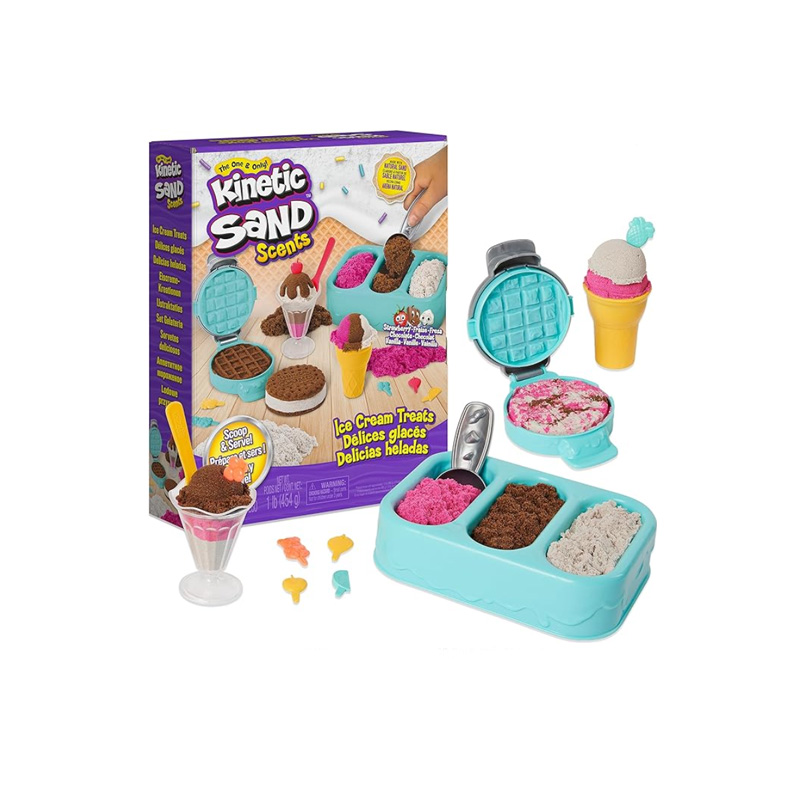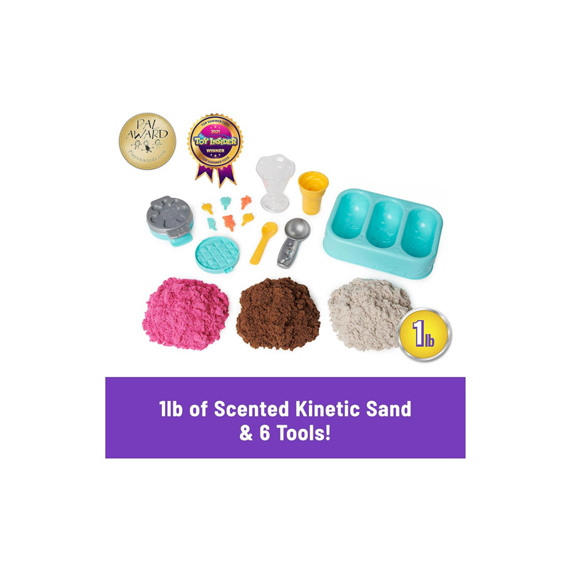 Mezcla, moldea y crea tus propias copas para helado, gofres, sándwiches de galletas de helado y conos de helado! Kinetic Sand nunca se seca, por lo que puedes crear infinidad de figuras.