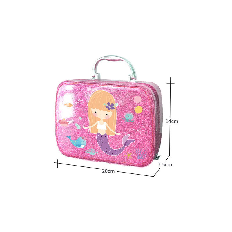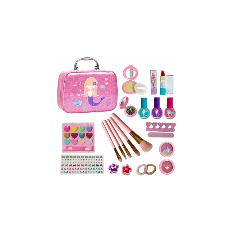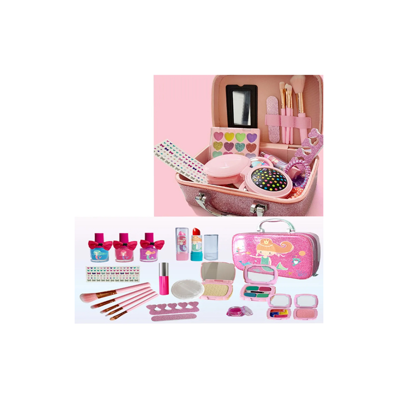 Este set de maquillaje infantil seguro y lavable esta elaborado con materiales no tóxicos de alta calidad y una formula soluble en agua suave y no irritante ideal para la piel delicada de las niñas, permite una limpieza fácil solo con agua o jabón e incluye esmaltes de unas despegables fabricados en material ABS que se aplican y retiran fácilmente para cambiar manicuras en cualquier momento, el completo kit contiene 24 piezas entre sombras labiales brochas esmaltes accesorios y una practica bolsa de maquillaje con diseño de sirena de gran capacidad que facilita el orden y transporte, es ideal para juegos de simulación con amigas fomentando la creatividad la imaginación y el juego sin pantallas, convirtiéndose en una excelente opción de regalo para cumpleaños Halloween o Navidad.