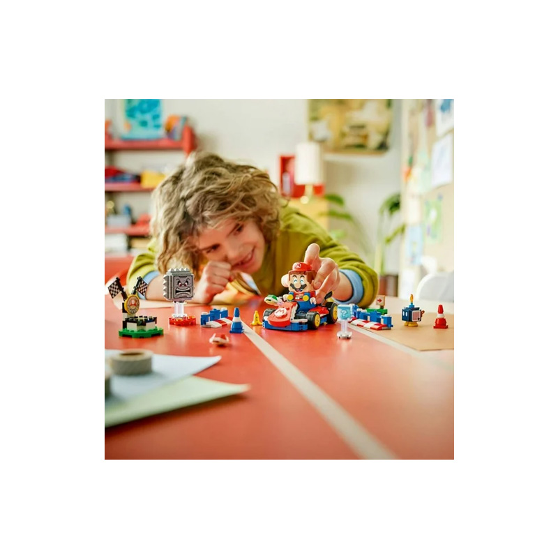 Crea tu propio circuito de competencia con el set LEGO Super Mario inspirado en Mario Kart, que incluye a LEGO Mario en su Kart estándar con capacidad de derrape y lanzamiento de caparazones, además de un Bob-omb, un Roca Picuda y un divertido plátano decorado. Este juego de construcción de 278 piezas permite montar una zona de salida, barreras conectables, conos de tráfico y un podio de victoria para vivir carreras llenas de sonidos, efectos visuales y recompensas digitales. Ideal para niños, niñas y fans desde los 7 años, ofrece una experiencia interactiva donde podrás pilotar, competir, derrotar enemigos y recrear la emoción de Mario Kart en casa.