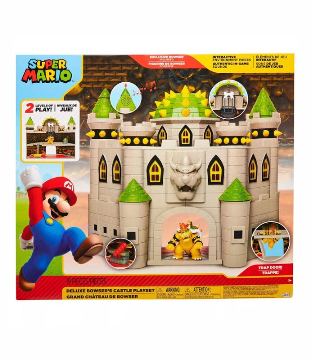 El juego de castillo de lujo de Bowser te permite explorar este nivel clásico de los videojuegos de Super Mario. En este juego se incluyen una figura EXCLUSIVA de Bowser de dos pulgadas y media, piezas de entorno interactivo con mecanismos de funciones y sonidos auténticos del juego. ¡Puedes mover el elevador hacia arriba y hacia abajo, hacer girar las bolas de fuego, abrir la parte inferior de la jaula y derrotar a Bowser activando la trampilla para dejarlo caer en la lava de abajo! Activa los sonidos y la música del juego presionando una de las agujas del castillo. Este juego funciona con la mayoría de las figuras de dos pulgadas y media.