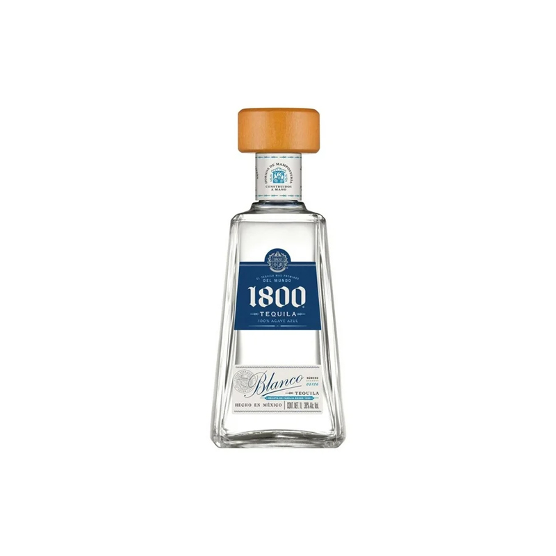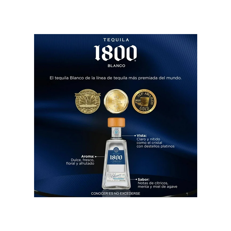 Tequila 1800 Blanco es un tequila 100 por ciento de agave que se distingue por su pureza y calidad al formar parte de la linea de tequila mas premiada de la historia. Se elabora a partir del maridaje de tequilas de diferentes añadas y cuenta con una maduración menor a siete semanas con un ligero añejamiento en barricas de roble blanco y partes de soleras francesas, lo que aporta suavidad sin perder la esencia del agave. Es filtrado en carbón para lograr un tono mas claro y un perfil limpio, ofreciendo notas puras y frescas que lo hacen ideal para cualquier paladar, ya sea para disfrutarse solo o en coctelería de alta calidad.