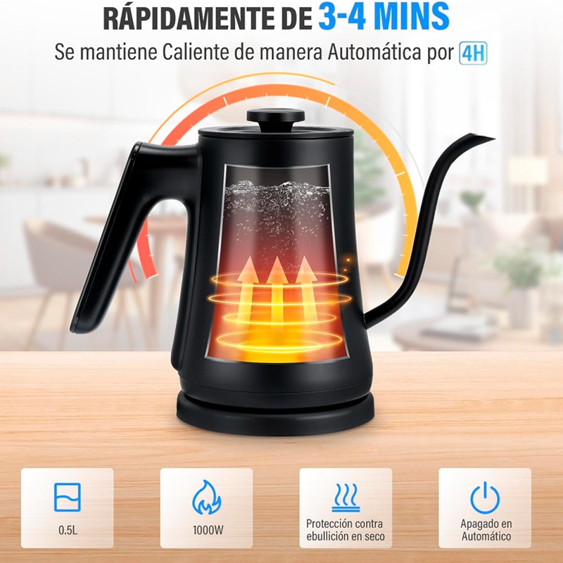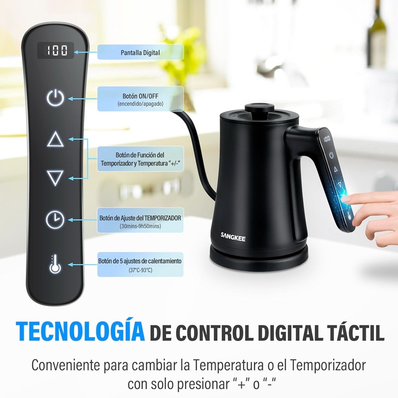 Panel de control Inteligente y Táctil en la agarradera: Eleve su experiencia al preparar té o café con nuestra tetera eléctrica. A diferencia de las teteras eléctricas nuestra tetera está equipada con diseño de panel de control táctil en la agarradera. Podrá encenderla haciendo el menor esfuerzo y configurar la temperatura adecuado además de ajustar el temporizador con un simple toque. Vuelva nuestra tetera eléctrica con diseño de cuello de cisne su mejor compañera al preparar café.
